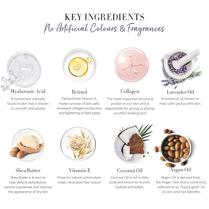 - NOURISH & HYDRATE: Packed with skincare essentials such as Essential Oil, Collagen, Shea Butter, Argan Oil, Vitamin E and Hyaluronic Acid. Refresh your routine! Experience skincare formulas formulated to treat every need for every skin type. We have your skin covered.