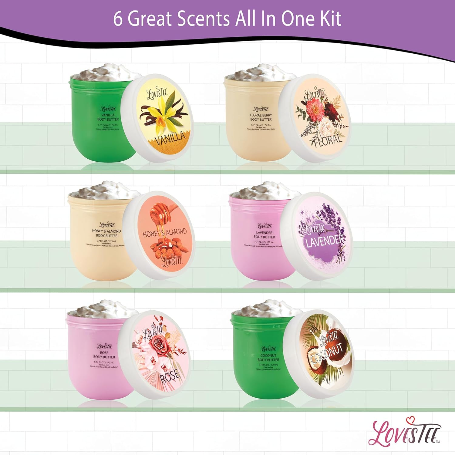 - Elegant Butter Body Lotion Gift: Includes a Variety of 6 Natural Butters, Lavender, Honey Almond, Vanilla, Rose and Coconut