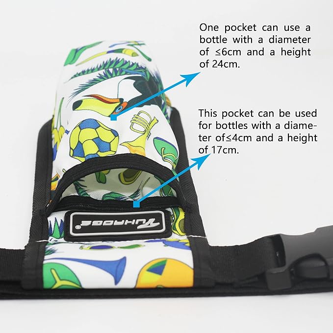 - 3、The design of the Fanny pack: The design of the Fanny pack has 3 pockets in front and three pockets in front, and 2 pockets in front.One pocket can be used for bottle with diameter ≤2.36inch and height ≤ 9.45inch. The inner pocket can be used for bottle diameter ≤1.57inch, 6.74inch high, can be changed to a suitable size of bottle;