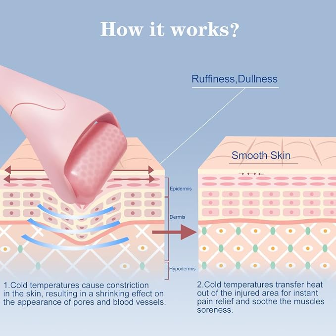 - CALM SKIN - After using the ice roller for face, you will feel cool and comfortable, it can help you effectively shrink pores and relieve skin pain; the rolling will greatly promote blood circulation and detox, tighten your skin, reduce wrinkles and puffiness, and keep your face shiny.