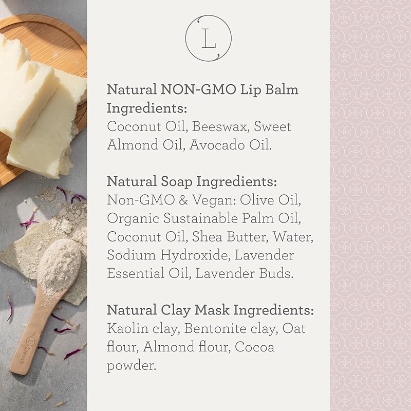 - INCLUDES: All-natural bath set includes: ❀ Scented Candle ❀ Lavender Natural Soap Bar ❀ Clay Facial Mask ❀ Unscented Lip Balm ❀ Eye mask ❀ Door Hang Tag - "Pampering in service" ❀ Gorgeous elegant box (5*5*3) ❀ Beautiful message card. All items are handmade all natural in the USA.