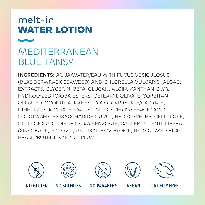 - Special Feature : Dive into weightless hydration. This lightweight, concentrated body lotion, infused with nourishing sea grape and barrier-supportive beta-glucan, quickly absorbs to leave skin feeling soft, supple and replenished, Contains: 1- 4 Ounce Tube of Seaweed Bath Co. Melt-In Mediterranean Blue Tansy Scented Water Lotion, We embrace the nourishing magic of the ocean in everything we do at Seaweed Bath Co. From sustainably harvested seaweed to the endless gifts of the sea, our natural and effective products energize, inspire and restore, All Seaweed Bath Co. products are made with natural, marine-derived ingredients. We’re Leaping Bunny certified, cruelty free, vegan, gluten free, paraben free, sulfate free and packaged in post-consumer recycled plastic, Consciously created, we use a bounty of marine-derived ingredients - including nutrient-rich, sustainably harvested seaweed - to infuse your skin and hair with the unending power and benefits of the ocean Dive into weightless hydration. This lightweight, concentrated body lotion, infused with nourishing sea grape and barrier-supportive beta-glucan, quickly absorbs to leave skin feeling soft, supple and replenished, Contains… See more