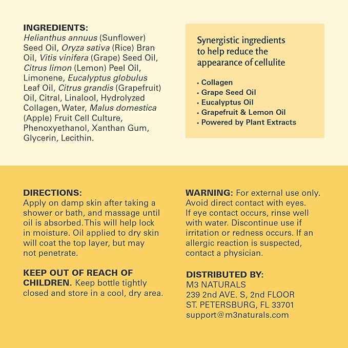 - M3 Naturals Anti Cellulite skin tightening massage oil will help moisturize, tighten, firm cellulite from your hips, abdomen, thighs, and buttocks. Minimize the look of cellulite and relieve sore muscles, this skin care body oil works better than any cellulite cream and will restore your beautiful skin.