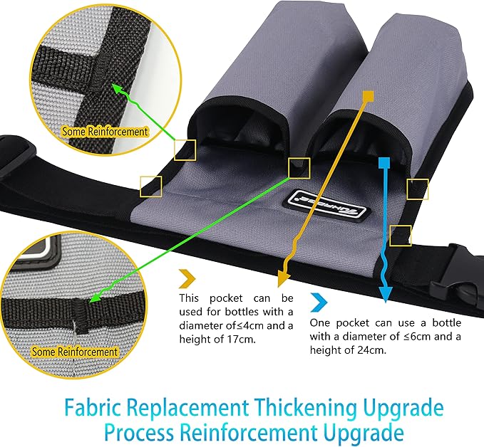 - 3、Design: * The design of the bag has a total of 5 pockets, the front design has two large pockets and two small pockets can be used for different capacity bottle, the large pocket can be used for the diameter ≤2.36inch 9.45inch bottle; In addition, the two small pockets can be used for bottles with diameter ≤1.57inch and height of 6.73inch;