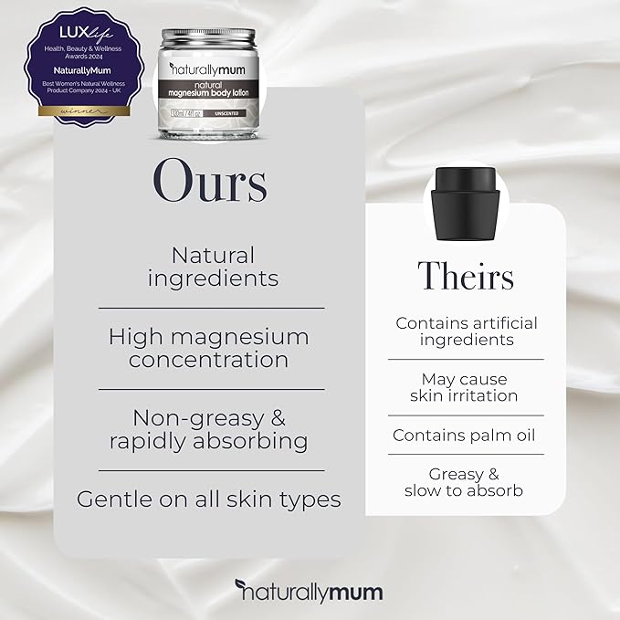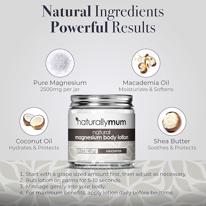 - Special Feature : NOURISH YOUR SKIN: Our body lotion includes coconut oil, macadamia oil and shea butter to ensure your skin is smooth and hydrated after application., EASY-TO-USE: Rub the lotion on your palms for 5-10 seconds. Then apply to your body in circular motions and massage gently., CRUELTY FREE & MADE IN UK: Every jar of lotion is handmade with love in the UK! We also use 100% eco-friendly, recyclable packaging., 100% NATURAL & VEGAN: Our Magnesium Body Lotion is made from 100% all natural aromatherapy ingredients. We use no artificial preservatives, colors or fragrances so you can be sure it is safe for you and your kids., SUPPORT YOUR HEALTH: Magnesium helps support sleep, heart, bone, nerve, gut and muscle health. NOURISH YOUR SKIN: Our body lotion includes coconut oil, macadamia oil and shea butter to ensure your skin is smooth and hydrated after application., EASY-TO-USE: Rub the lotion on your palms for 5-10 seconds.… See more