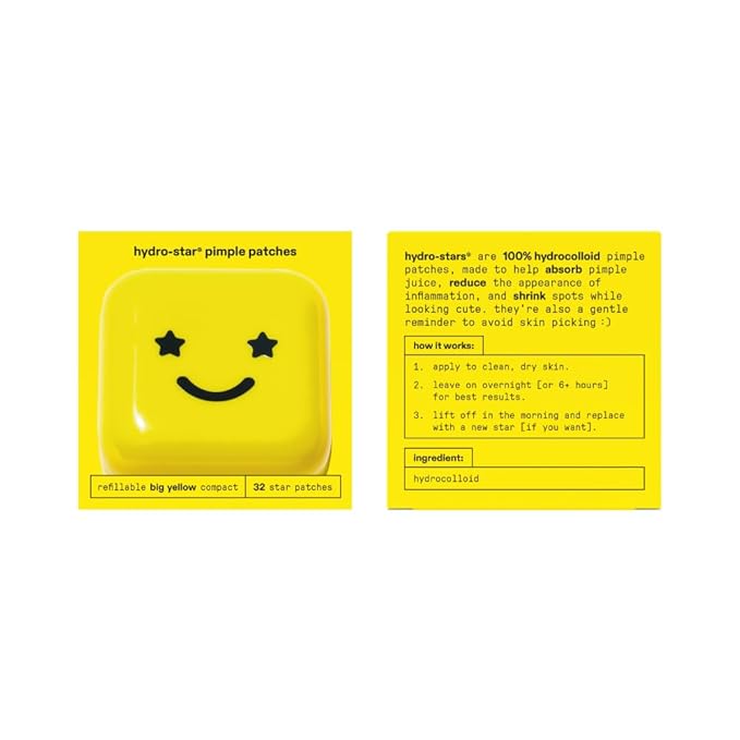 - CUTE & EFFECTIVE: A star-shaped pimple patch that's out of this world. Made with 100% hydrocolloid to help absorb fluid, reduce redness, and shrink spots while looking cute. Conveniently packaged in a refillable Big Yellow compact with a mirror inside.