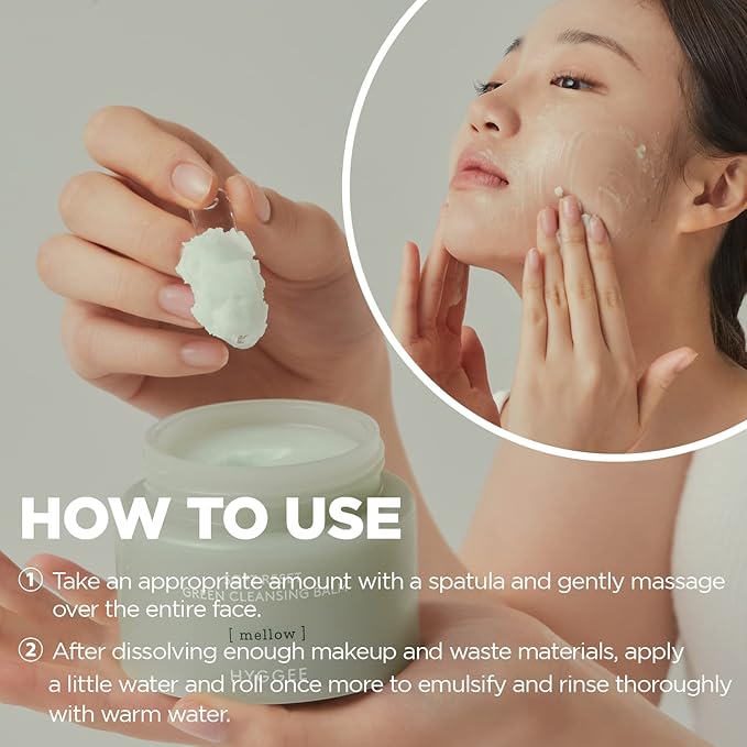 - SUPER DEEP CLEANSING BALM: Hyggee Soft Reset Green Cleansing Balm is a soft cleaning sherbet-type formula that melts the moment it touches the skin and leaves only the moisture of the superfoods. This cleansing balm for face gently deep cleans up to point of makeup, wastes, and old dead skin cells.