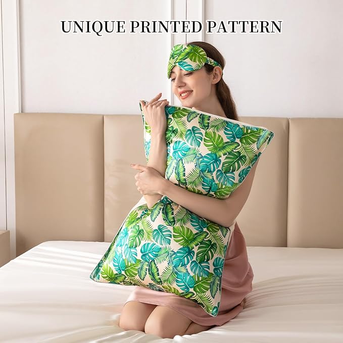 THXSILK Sleep Mask 100% 19 Momme Pure Mulberry Silk Super Smooth Cooling Decorative Sleep Eye Mask Blackout Eye Cover with Wide Head Strap, Monstera-Green