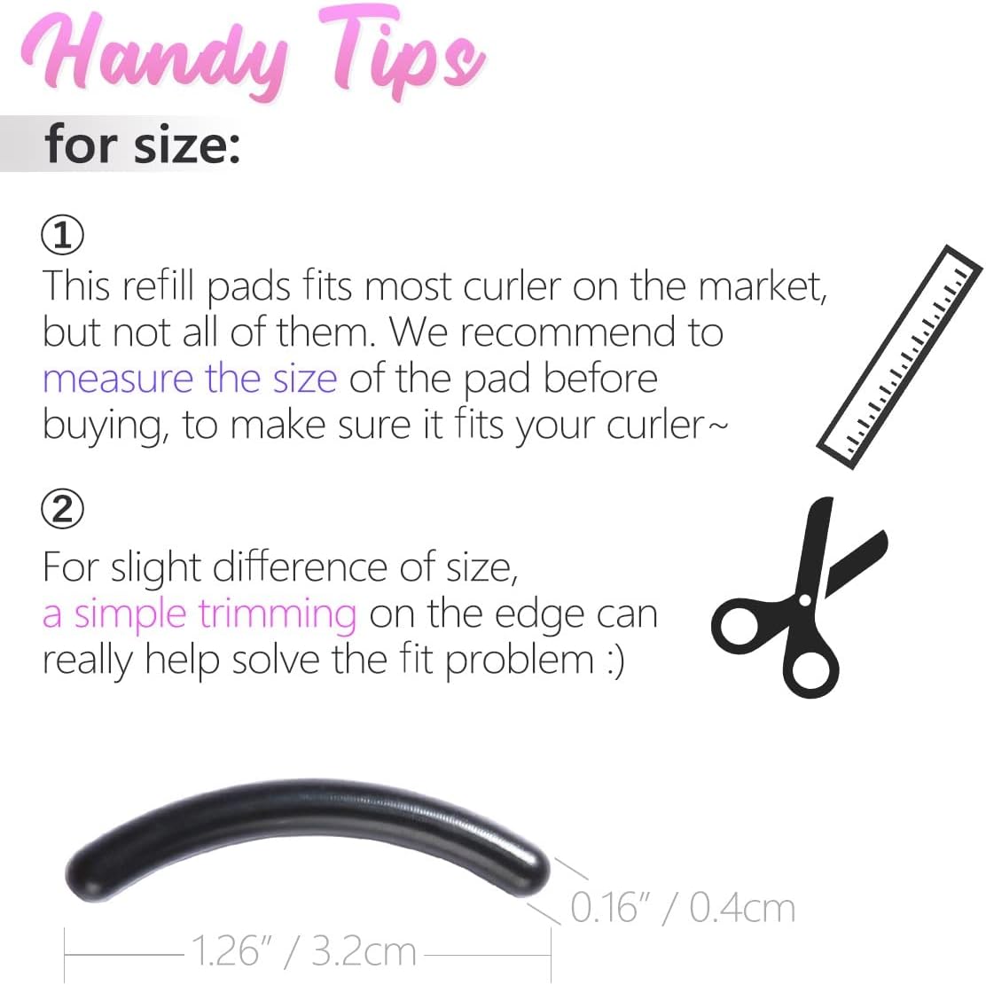 - ❤【Common size curler pads fit most eyelash curlers】Each curler replacement pad is about 1.26 inch/ 3.2 cm in length, 0.16 inch/ 0.4 cm in thickness, suitable for most of eyelash curlers; Please confirm whether the size of the eyelash pad is suitable for your eyelash clip before purchase, otherwise it is easy to pinch eyelashes.