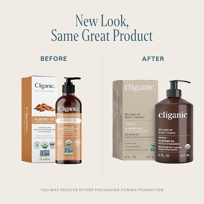 Cliganic Organic Sweet Almond Oil, 100% Pure (8oz) - for Skin & Hair, Nourishing Carrier Oil for Face & Body (Packaging May Vary)