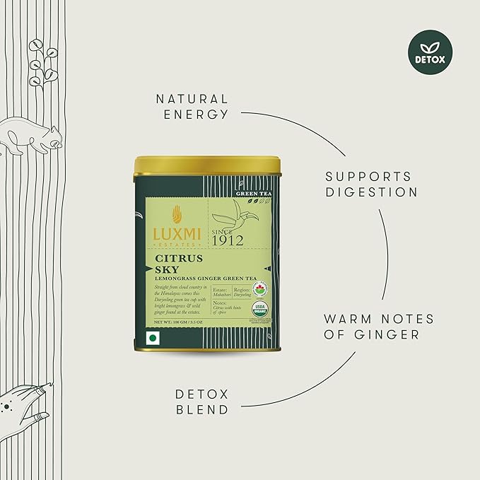 Luxmi Estates Citrus Sky Green Tea 100gm Tin | Certified Organic Darjeeling Green Tea
