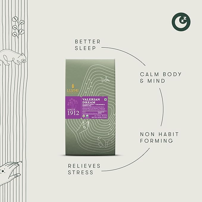 - Luxmi Estates Valerian Dream Tea offers a soothing blend of USDA Certified Organic Herbal Tea, curated to support a healthy and calming response. Each pack contains 25 tea bags, with a total weight of 50g, ensuring you have a plentiful supply of this comforting and natural tea to promote relaxation.