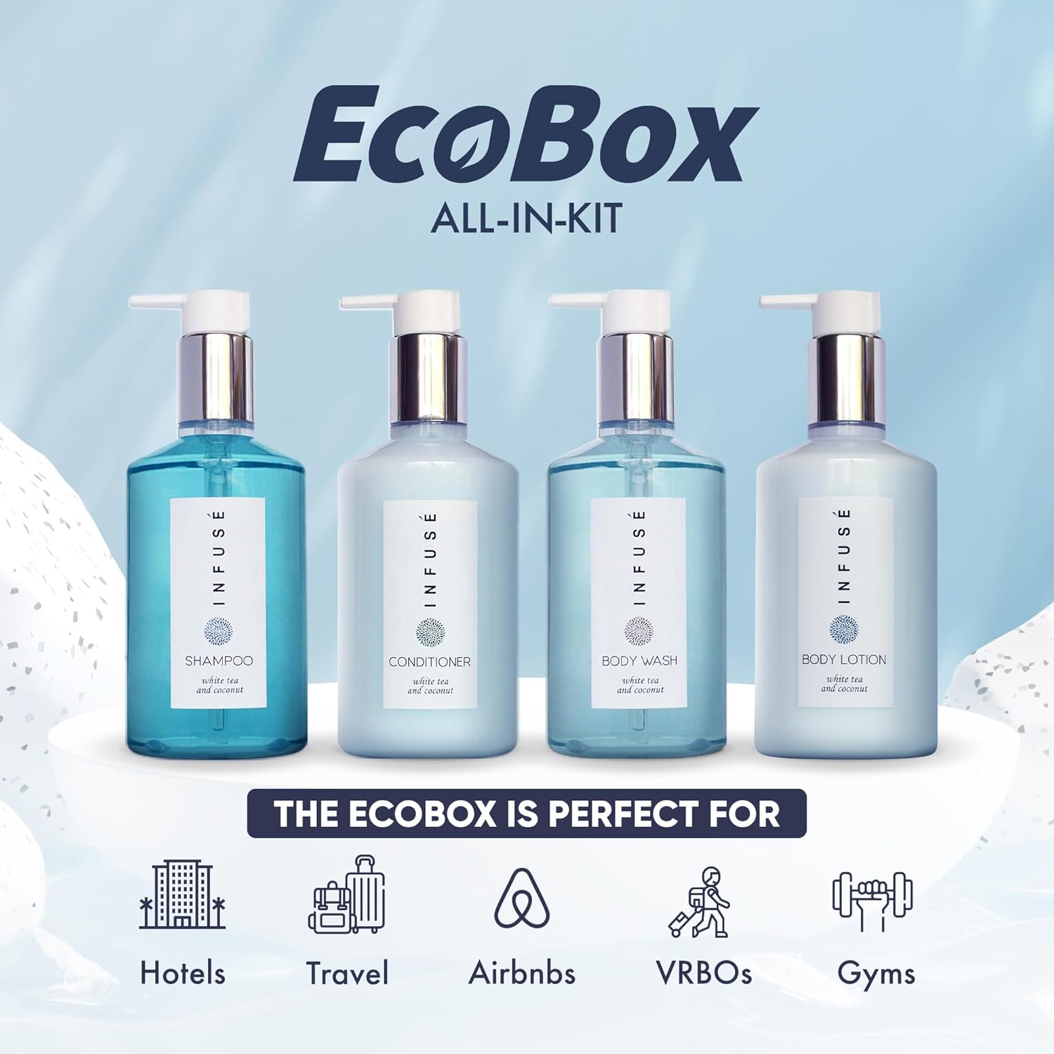 - MINIMAL WASTE, MAXIMUM EFFICIENCY: EcoBox hotel soap kits are designed with vacation rental owners and Airbnb hosts in mind. Unlike classic travel size bottles of bathroom soap that contribute to waste, our compact refillable soaps allow you to minimize your ecological footprint. Additionally, we offer gallon size bottles of our products, ensuring a seamless refill process for our convenient 10.14oz pump bottles.
