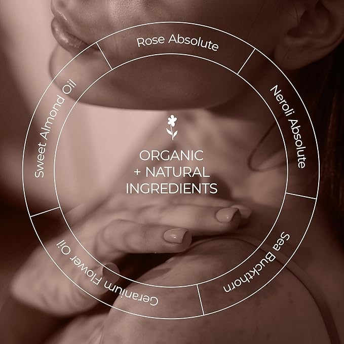 - ORGANIC + NATURAL INGREDIENTS: Vitamin E, Sweet Almond Oil, Grape Seed Oil, Rose Hip, Geranium, Jojoba, Tangerine, Sunflower, Lavender and Sea Buckthorn Oil come together to soften, smooth, hydrate and moisturize skin leaving you with a healthy, dewy glow