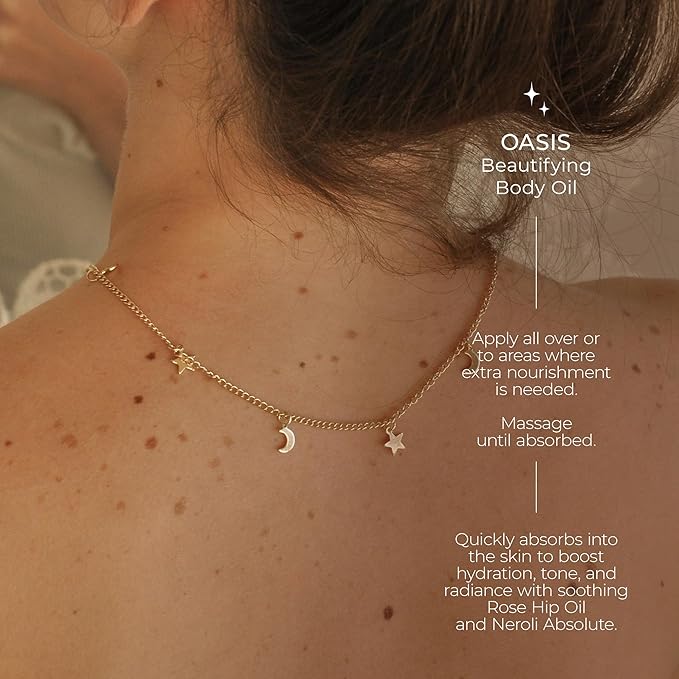 - BEAUTIFYING BODY OIL: This nutrient rich dry oil formula quickly absorbs into the skin with no greasy residue, boosting hydration and tone leaving radiant, glowing skin. Infused with botanical oils, Oasis will leave your skin feeling nourished and fresh with an intoxicating natural slightly scented fragrance.