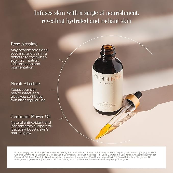 Organic Skin Care Products Made in USA, Vegan, Cruelty Free, Moisturizing + Hydrating Beautifying Body Oil with Rose Hip Oil, 4fl oz/118ml, Oasis
