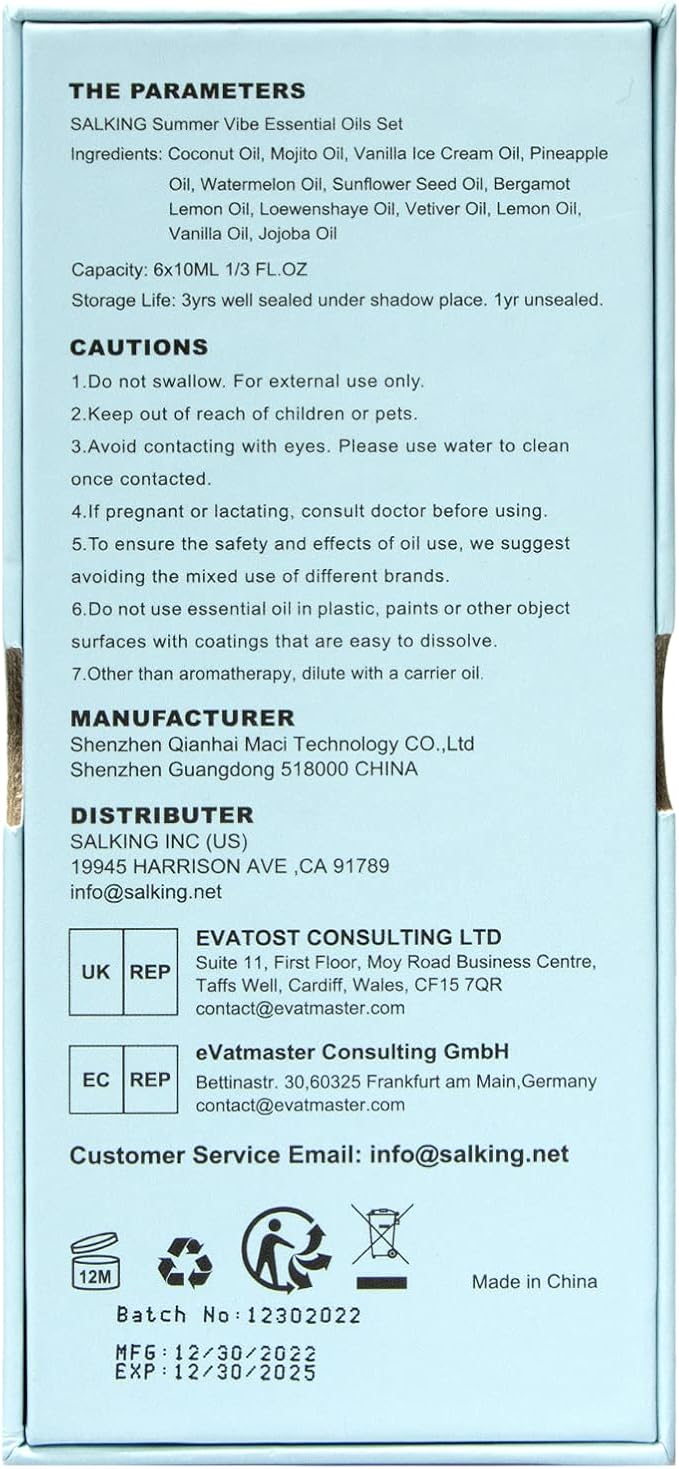 - Safety - SALKING premium grade fragrance oils are highly concentrated, enhanced formulations designed by our master perfumer. Our summer fragrance oils set are packaged in dark amber bottles to avoid scents diminishing due to light. And meet rigorous quality standards which are vegan friendly and zero testing on animals. Please note that these scented oils are for external use only. Now you can have the fresh scents of summer in your living room all year long.