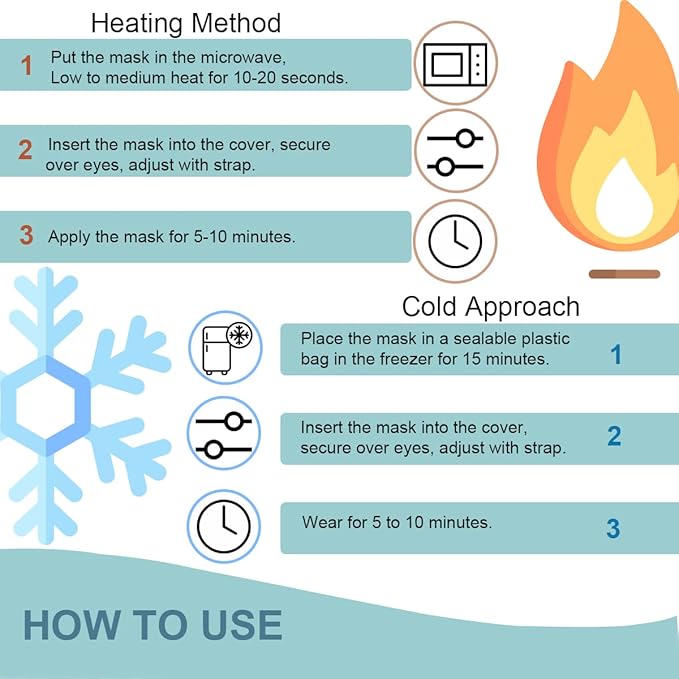 - HOT & COLD THERAPY: Just simply put the cool eye compress in the freezer for 1 hours for cold therapy or heat it in the microwave for 10s for heat therapy. Use the plush side for warmth or the breathable side for coolness. The eye mask has a separate detachable mounting bag for easy storage and extended life, and the outer packaging is washable.