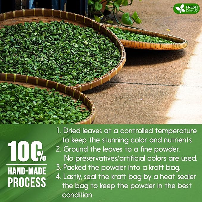 - ☘️ HAND-MADE PRODUCING PROCESSES, NO ADDITIVES: Our Pandan Leaf Powder was processed in a hygienic environment, and then packed in a Re-sealable bag to make a long self-life product, ensure the safety of customers and quality of products. Sugar-Free, Caffeine Free, Gluten Free, Vegan, No Artificial Flavors, No Colors Added.