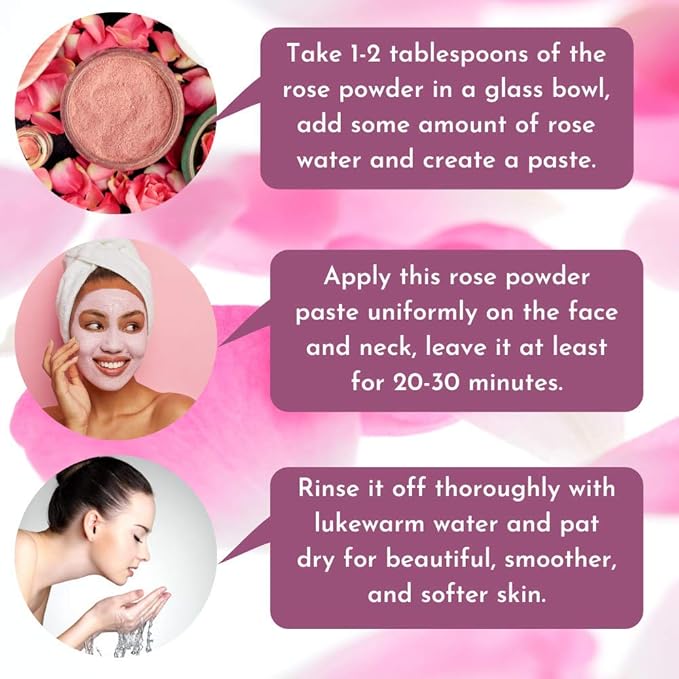 - ★ 𝐇𝐞𝐥𝐩𝐬 𝐭𝐨 𝐦𝐚𝐤𝐞 𝐬𝐤𝐢𝐧 𝐟𝐫𝐞𝐬𝐡 𝐚𝐧𝐝 𝐭𝐨𝐧𝐞𝐝: Applying rose petal powder in the paste form will tighten your skin and shrink large pores keeping your skin clean and toned. Using rose powder organic will give smooth and supple skin. Rose petal powder traps moisture into the skin and makes skin smooth and fresh. It is the best solution for uneven skin tone and pigmentation, and it also makes skin smooth, soft and glowing.