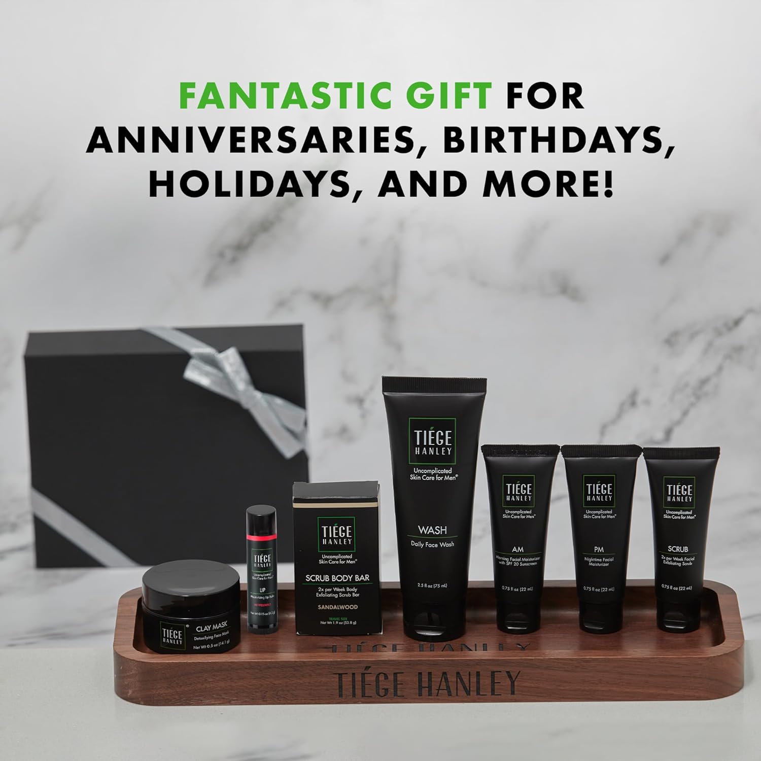 - Enhance Your Handsome: The Tiege Hanley Silver Gift Set is the ultimate indulgence for the modern gentleman who takes his skin care seriously. Includes face wash (2.5oz), AM moisturizer (0.75oz), exfoliating scrub (0.75oz), PM moisturizer (0.75oz), clay mask (0.5oz), sandalwood exfoliating body bar (1.9oz), and lip balm. This skin care gift set provides a 30-day supply, making it the perfect gift for holidays, birthdays, and other special occasions.
