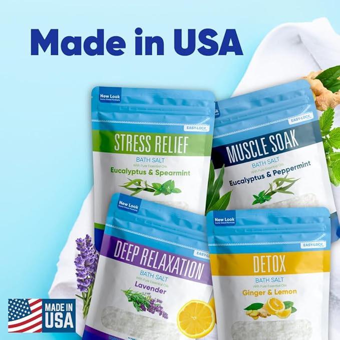 - New Epsom Salt Bath Salts Sampler Set: Deep Relaxation Bath Soak, Muscle Bath Soak, Detox Bath Soak, and Stress Relief Bath Soak