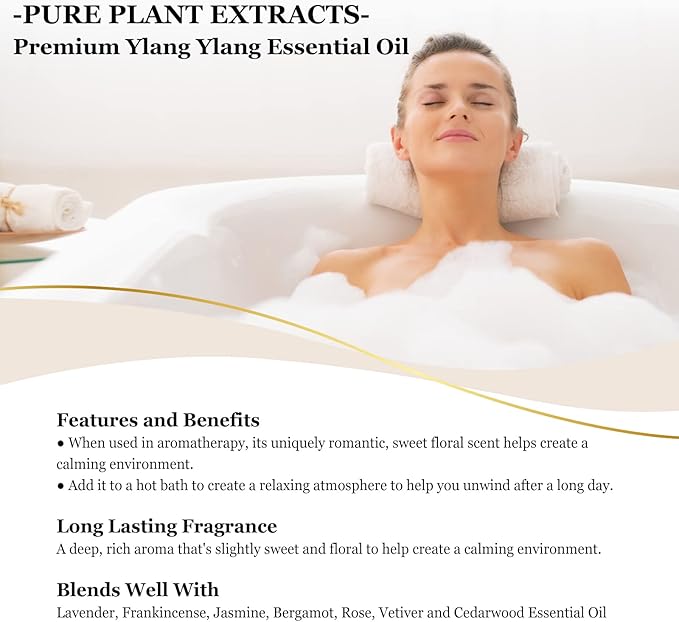 - QUANLITY ASSURANCE - Ylang Ylang comes from the tropical flowers of the tree bearing the same name, not add any additives, fillers. Ylang Ylang essential oil has a romantic, floral scent that many find uplifting and enjoyable.