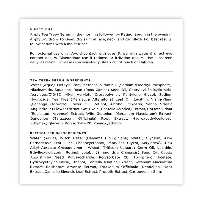 - Directions: Apply Tea Tree+ Serum in the morning followed by Retinol Serum in the evening. Apply 3-5 drops to clean, dry skin on face, neck, and décolleté. Use sunscreen daily, as retinol increases sun sensitivity. For best results, follow serums with a moisturizer.