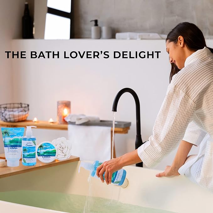 - COMPLETE HOME SPA EXPERIENCE: This stunning 8 pieces bath gift set includes 5 amazing Ocean scented bathing essentials and Bath Bomb, Towel, Mirror. The bath essentials are a shower gel, a bubble bath, a body butter and a body lotion. It rejuvenate the skin while transforming any bath into a soothing retreat. Perfect for self-care lovers, this spa set offers a calming and indulgent experience, leaving skin refreshed and pampered.