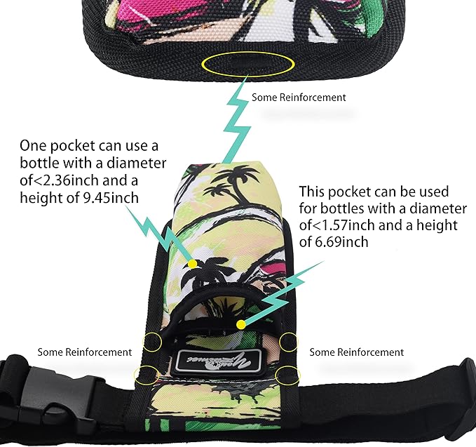 - 3、Design: * The design of the bag has a total of 3 pockets, the front design has two large pockets and two small pockets can be used for different capacity bottle, the large pocket can be used for the diameter ≤2.36inch 9.45inch bottle; In addition, the two small pockets can be used for bottles with diameter ≤1.57inch and height of 6.69inch;