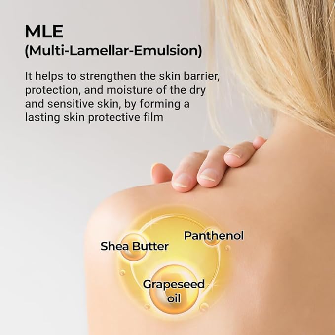 - HYPOALLERGENIC & SAFE: MLE complex with shea butter, grape seed oil, and panthenol mimics healthy skin structure to boost absorption, lock in moisture, and provide lasting hydration for sensitive skin.