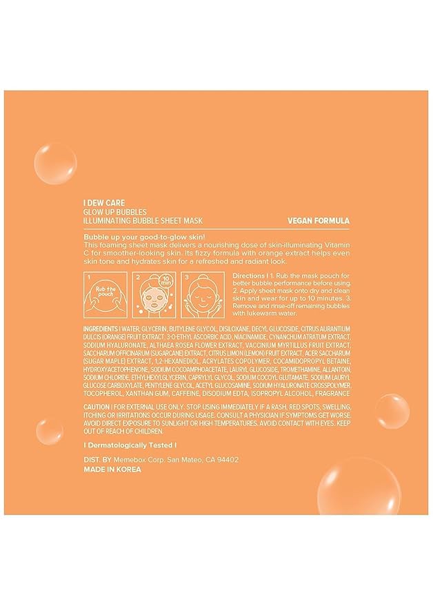 - Fluoride & Peas Free: I Dew Care Vitamin Bubble Sheet Mask has incorporated a non-toxic, skin-friendly ingredient (decyl glucoside) as a foaming agent to make bubbles that love your skin.