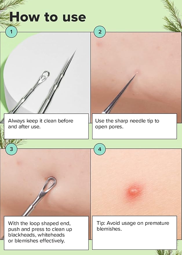 - Dual Sided: This dual-tip tool helps remove blackheads, whiteheads and blemishes with a gentle touch. Sharp needle tip for opening pores, and loop shaped end for cleaning up blackheads, whiteheads, and blemishes.