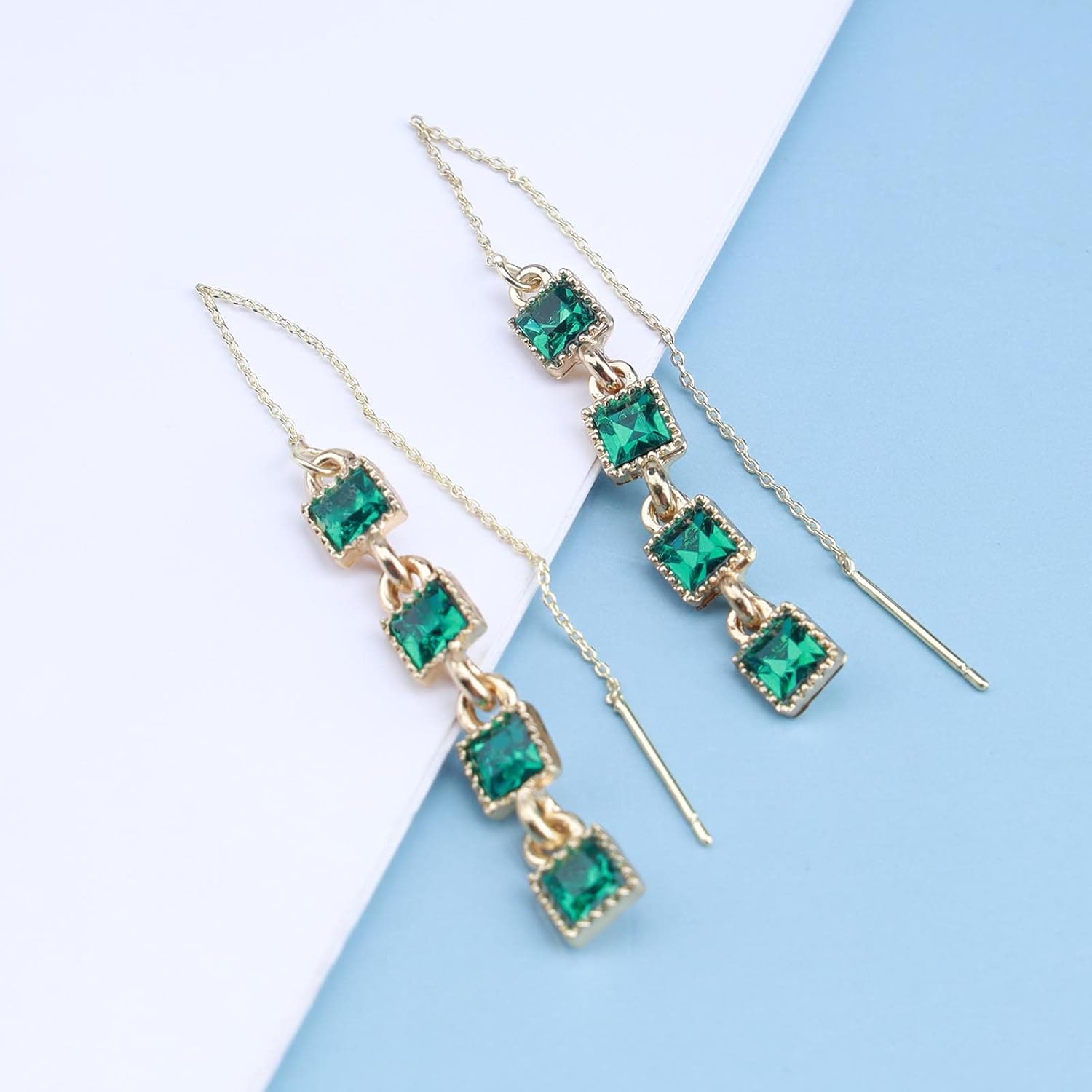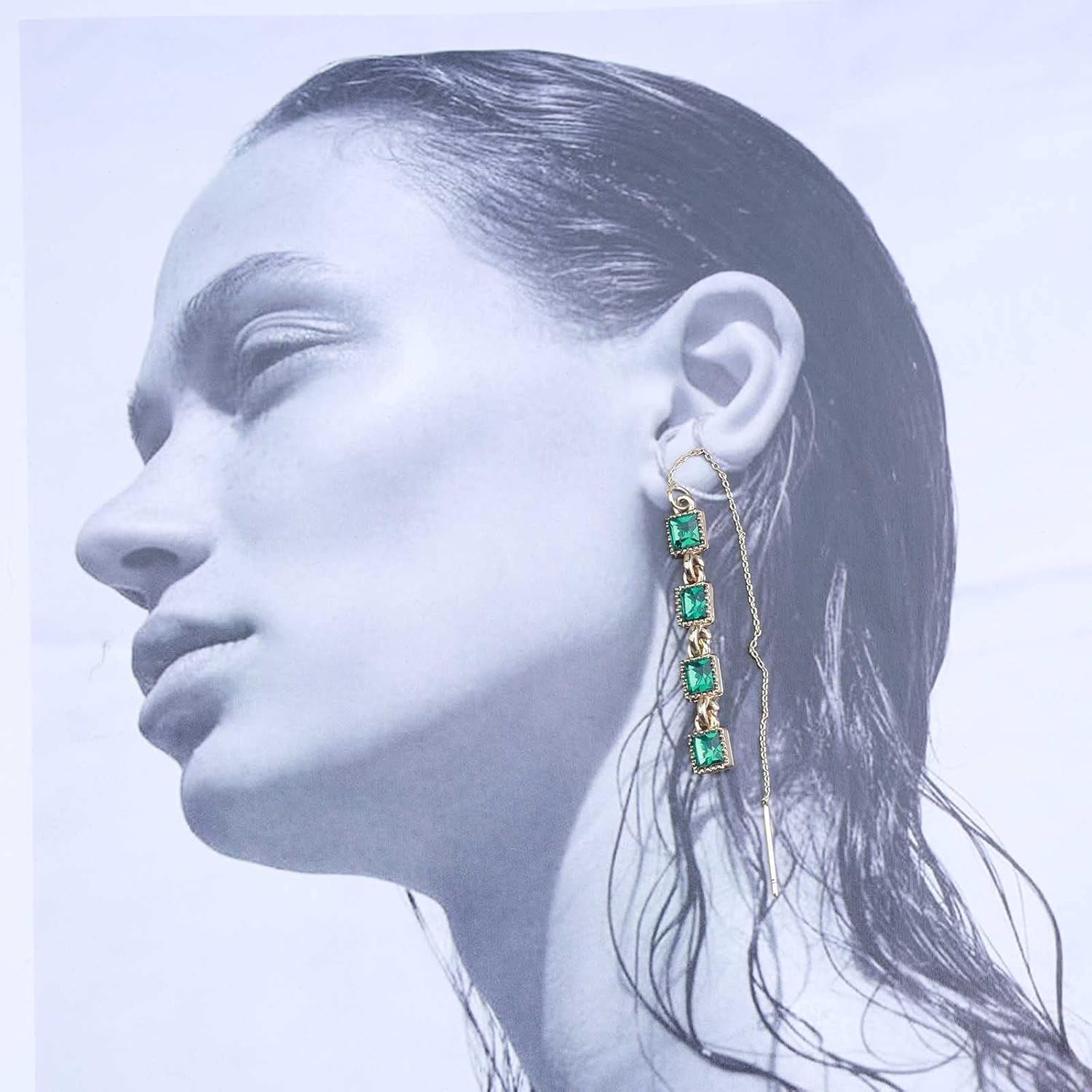 Vintage Crystal Emerald Threader Earrings Emerald Square Stud Earrings Long Chain Tassel Dangle Earrings Gold Bar Pull Through Earrings Jewelry for Women