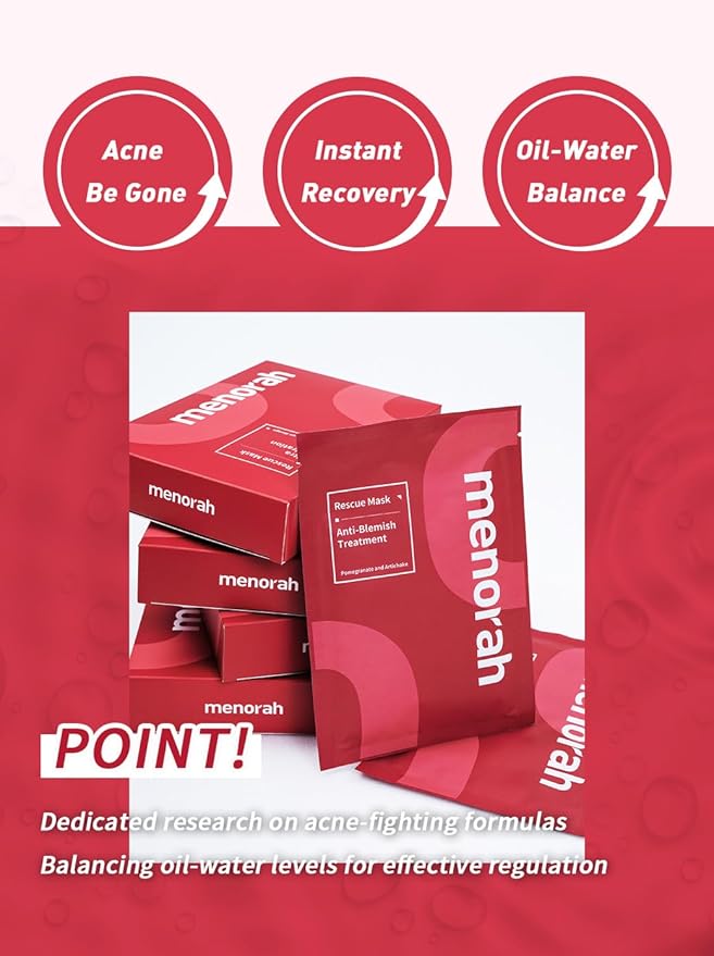 menorah skincare - Anti-Blemish Treatment Rescue Sheet Masks (4 Sheets) - with Pomegranate, Artichoke, Acne Facial Masks, Instant Recovery, Oil-Water Balabce, Acne Skin, Organic cotton sheet mask