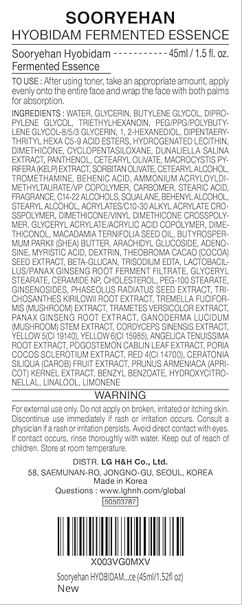 - SOORYEHAN HYOBIDAM FERMENTED ESSENCE (45ml/1.5fl oz) is a groundbreaking age-defying skincare solution with a creamy texture that effortlessly melts into the skin, delivering deep nourishment and improving elasticity. Witness a transformation to a smoother, more vibrant complexion, enhanced by the essence's potent wrinkle-reducing properties.