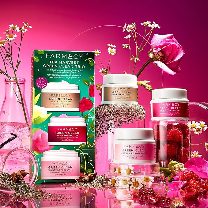 Farmacy Cleansing Balm Skin Care Set - Tea Harvest Travel Size Makeup Remover - Limited Edition Skincare Set Includes Warm Vanilla Chai, Wild Raspberry Tea + Chamomile Rose Latte (3 Count)