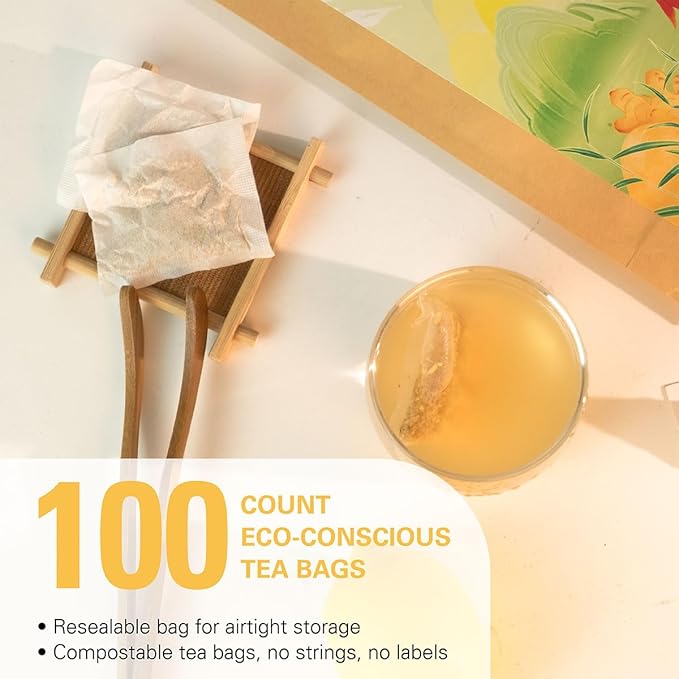 - 【Order with Confidence】100 ginger root tea bags (unbleached and compostable) come packed in a resealable kraft bag. No staples, strings, bags, or extra waste. If you have any questions, just send us an email and we will take care of it for you
