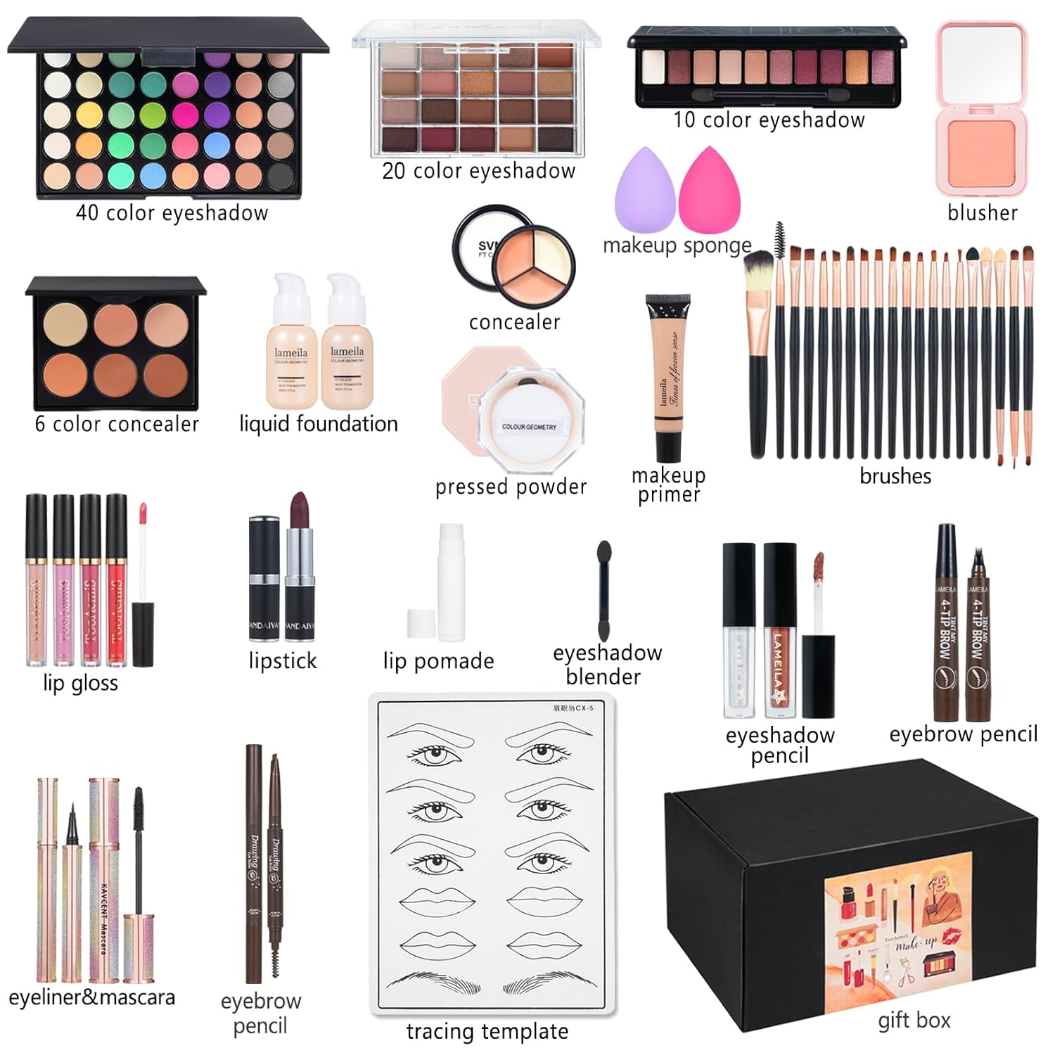 All in One Makeup Kit Makeup Kit for Women Full Kit Multipurpose Makeup ,eyeshadow、 liquid foundation,Loose powder,Eyebrow pencil,4-color lip gloss set