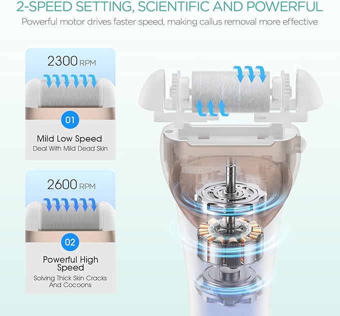 - Efficient & Comfortable, Safer - Powerful power drive can reach the scientific and fast speed of 2600rpm/s, makes it easier and more comfortable for you to remove dead skin and calluses on your heels. And VOYOR electric foot file has a safety mechanism: if excessive pressure is applied to the head, it will stop automatically, thus preventing injury.