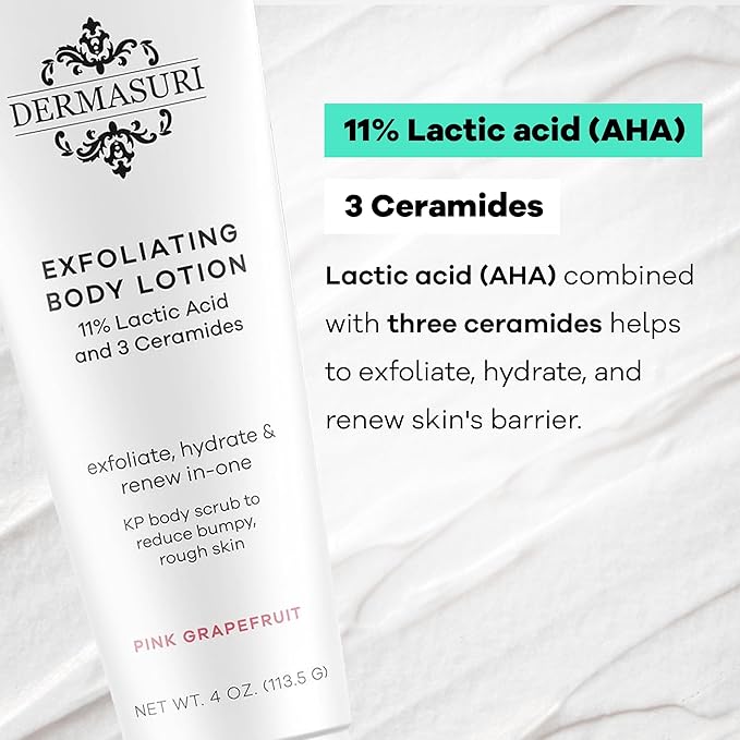 - EFFECTIVE EXFOLIATION: Dermasuri Exfoliating Body Lotion gently removes dead skin cells, helping to smooth rough and bumpy skin. Perfect gift idea for women for any occasion including anniversary, birthday, wedding and more!