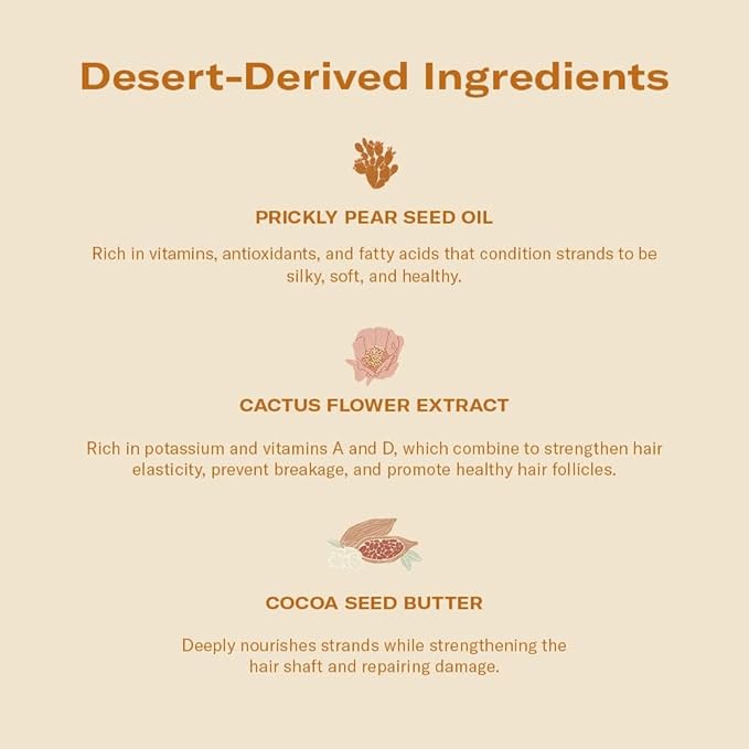 - KEY INGREDIENTS - Cactus Flower Extract: Strengthens hair elasticity, & prevents breakage. Cocoa Seed Butter: Nourishes strands, strengthens the hair shaft, & repairs damage. Prickly Pear Seed Oil: Conditions strands to be silky, soft, & healthy.