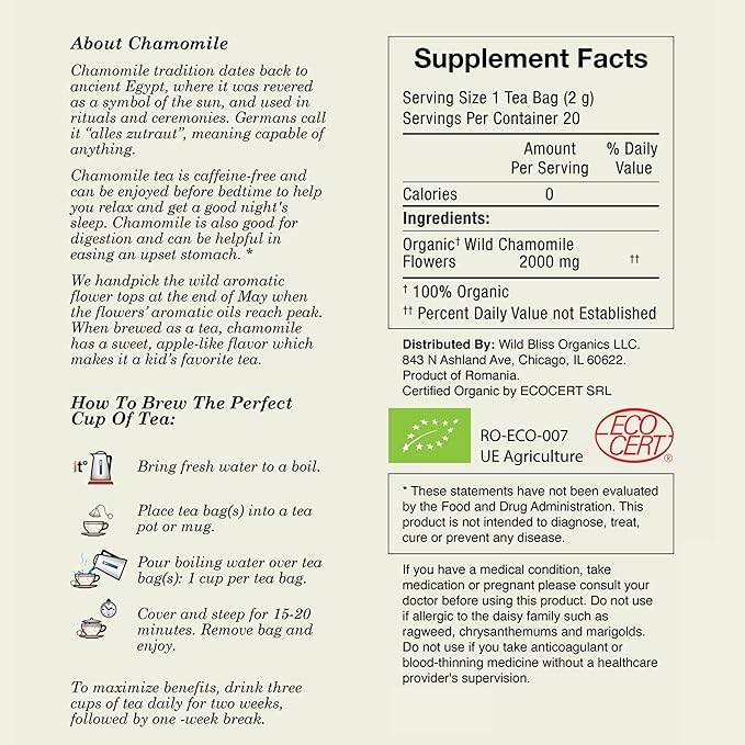 - PURELY WILD SOURCED; USDA CERTIFIED ORGANIC; Wild Bliss chamomile flower tisane is 100% natural, free of agricultural chemicals, non-GMO, has no added flavors, harmful additives nor preservatives; perfect addition to any pure vegan and gluten free diet
