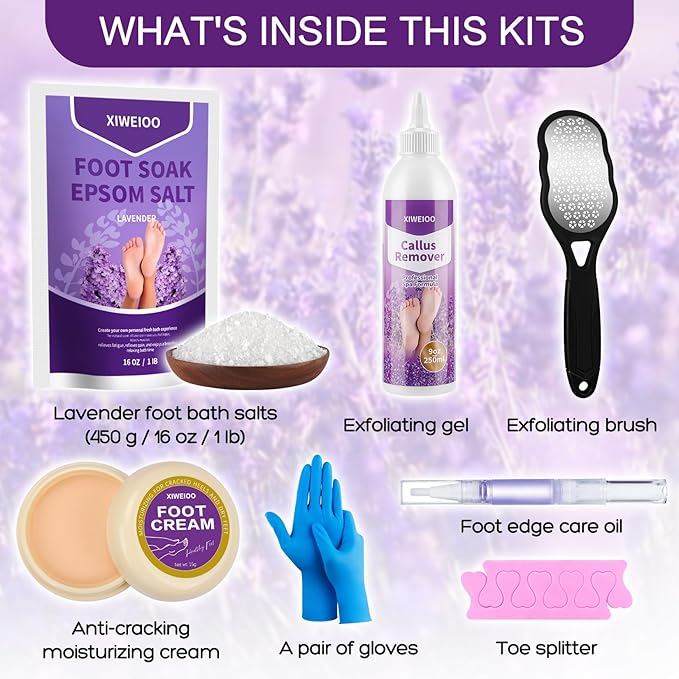 - 💕XIWEIOO Lavender salt soak kit: Lavender foot bath salts 1 IB, Anti-cracking foot cream 20g Exfoliating scrub 250ml 1 exfoliating brushA toenail treatment oil Two toes separate cotton pads One pair of professional foot bath gloves Lavender Foot Soak Body Detox Foot Soak for Dry Cracked Feet - Lavender Oil & Tea Tree Oil Foot Soaker – Pedicure Supplies for Foot Spa Soak
