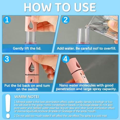- There is a mirror design on the lid, which allows you to observe the appearance or check the skin condition at any time. You can also use it to adjust or repair your makeup. It comes with 4 convenient USB cables and 4 nano facial sprayer with mirror, This is the perfect gift for parents, siblings, and friends