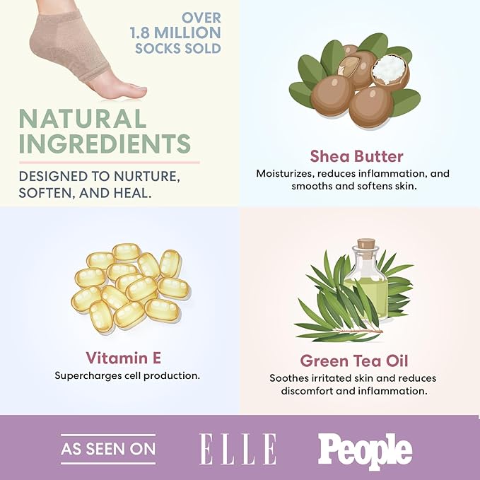 - Gel Lining Locks in Healing Moisture: Want to know our secret? The gel lining in our heel socks helps to trap moisture, allowing hydration and repair while you sleep. For more damaged heels or faster results, follow our recommended dream foot care routine: soak your feet, lather on lotion, and wear your socks all night long for the first 7 days. If you plan to wear the socks during the day, just skip the lotion to avoid slippery heels.