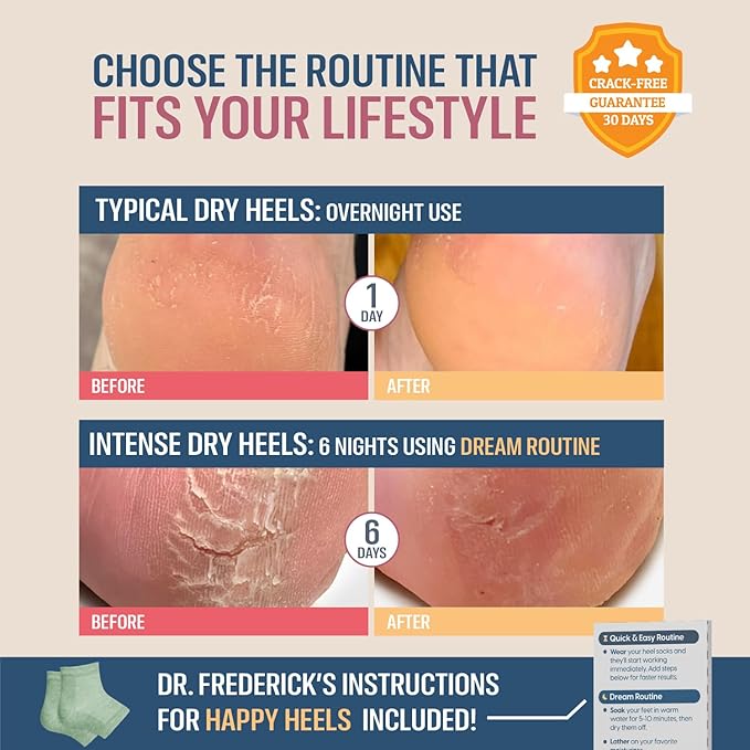 - Fast Cracked Heel Repair: Dr. Frederick’s Original Moisturizing Heel Socks are expertly developed to offer a soothing experience, hydrating heels in as little as 7 days. Reduce irritation and encourage healthy skin with our comfy, breathable, toeless heel socks. Plus, with our crack-free guarantee, you can purchase with confidence, knowing you’re getting the best moisturizing gel heel socks for dry cracked feet.