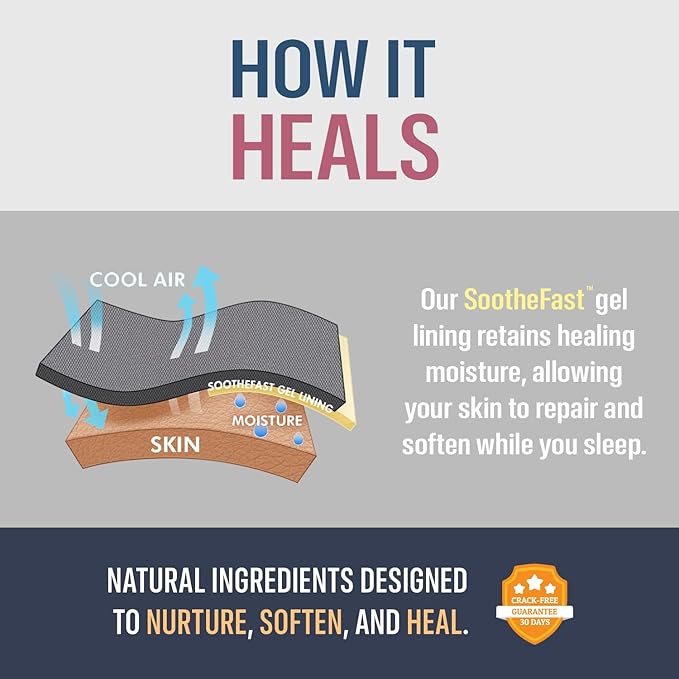 - Soothefast Gel Locks In Healing Moisture: Want to know our secret? The Soothefast Gel Lining in our Moisturizing Heel Socks is designed to lock in healing moisture, providing hydration to your dry heels all night long. For more damaged heels or faster results, follow our recommended dream foot care routine: soak your feet, lather on lotion, and wear your socks all night long for the first 7 days. If you plan to wear the socks during the day, just skip the lotion to avoid slippery heels.