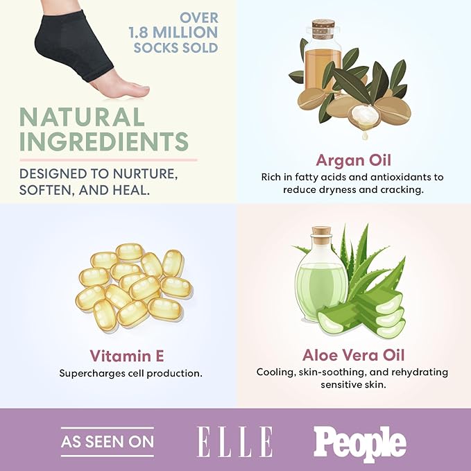 - Find Your Perfect Color Match: Our Moisturizing Heel Socks are all designed to soothe and heal your heels, but we offer a full line of options to suit your style. Our tan socks are packed with moisturizing shea butter, while our green socks’ main ingredient is healing aloe. We also offer black socks with hydrating argan oil, blue socks with softening jojoba, and our Original gray color which has our classic comprehensive blend including Vitamin E, Olive Oil, & Essential Botanical Oils.