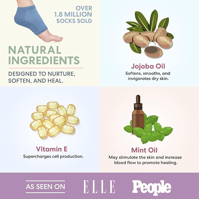 - Find Your Perfect Color Match: Our Moisturizing Heel Socks are all designed to soothe and heal your heels, but we offer a full line of options to suit your style. Our tan socks are packed with moisturizing shea butter, while our green socks’ main ingredient is healing aloe. We also offer black socks with hydrating argan oil, blue socks with softening jojoba, and our Original gray color which has our classic comprehensive blend including Vitamin E, Olive Oil, & Essential Botanical Oils.